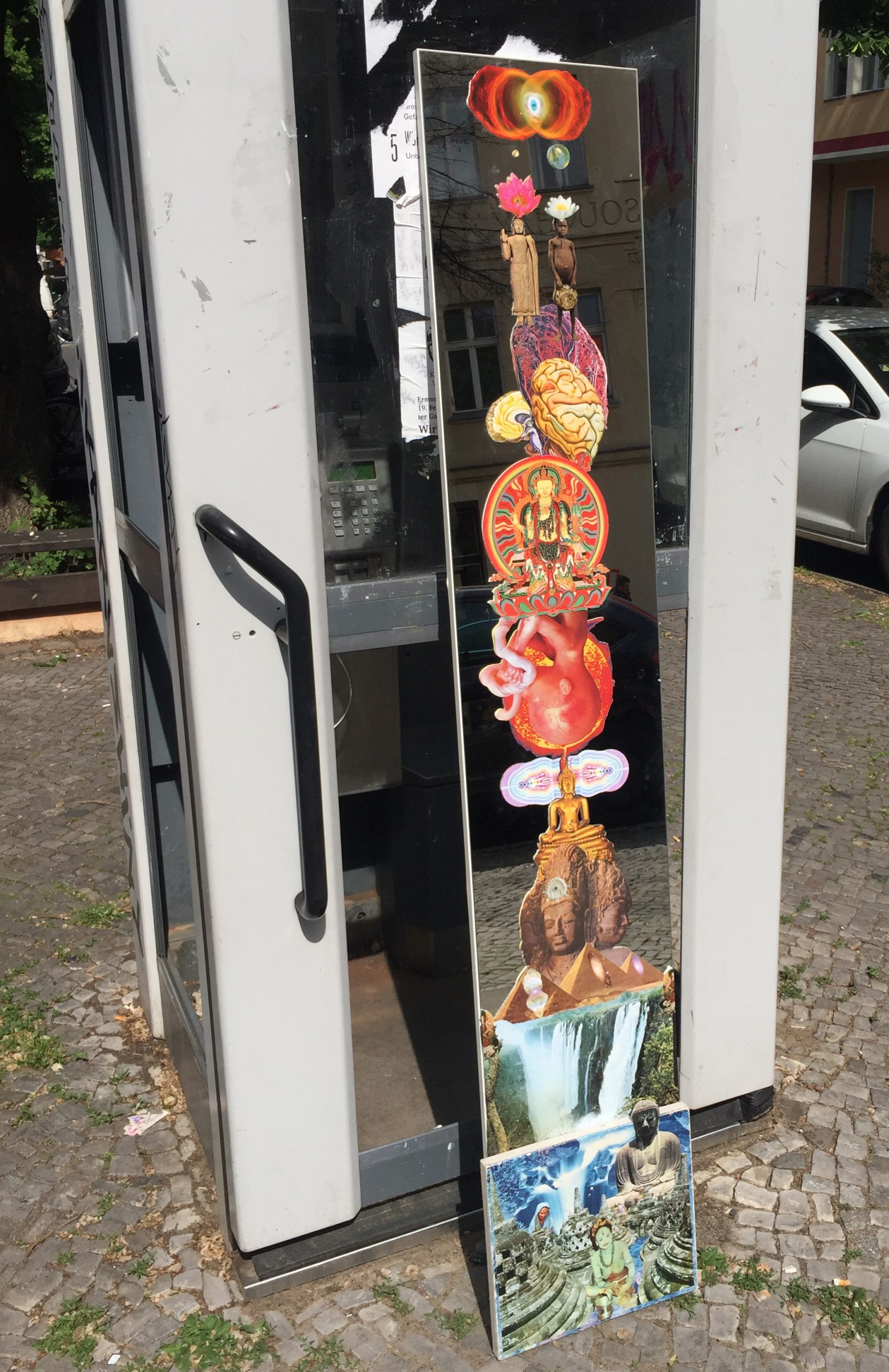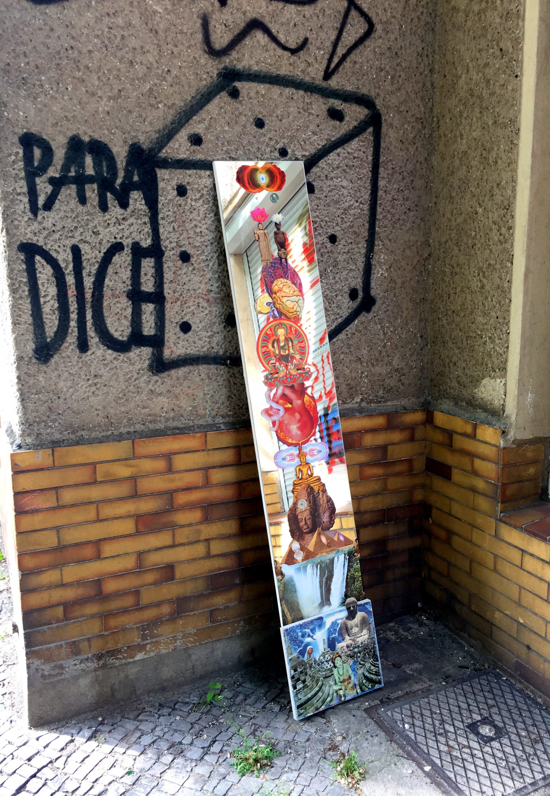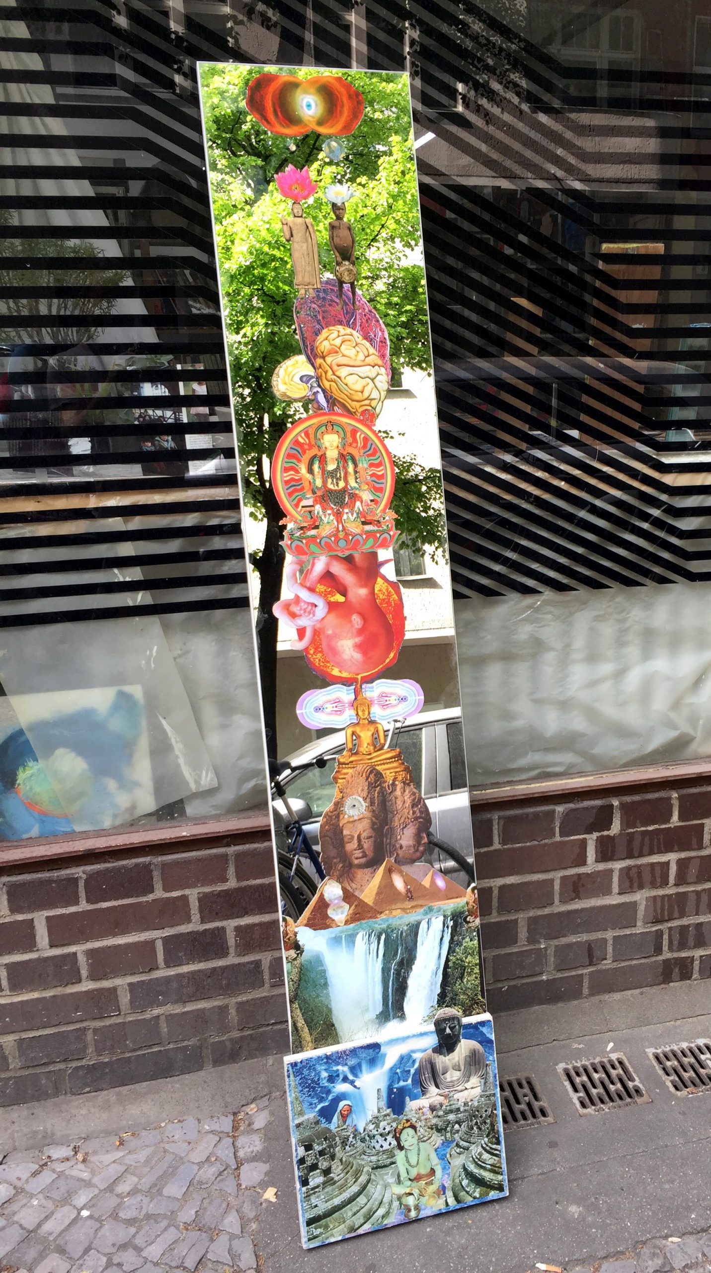 bodhichitta, paper collage on found mirror, 33cm x 185cm x 5cm, 2020