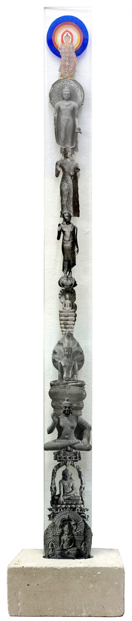 buddhas, paper collage and transparent plastic on glass, 12 x 120cm, 2017