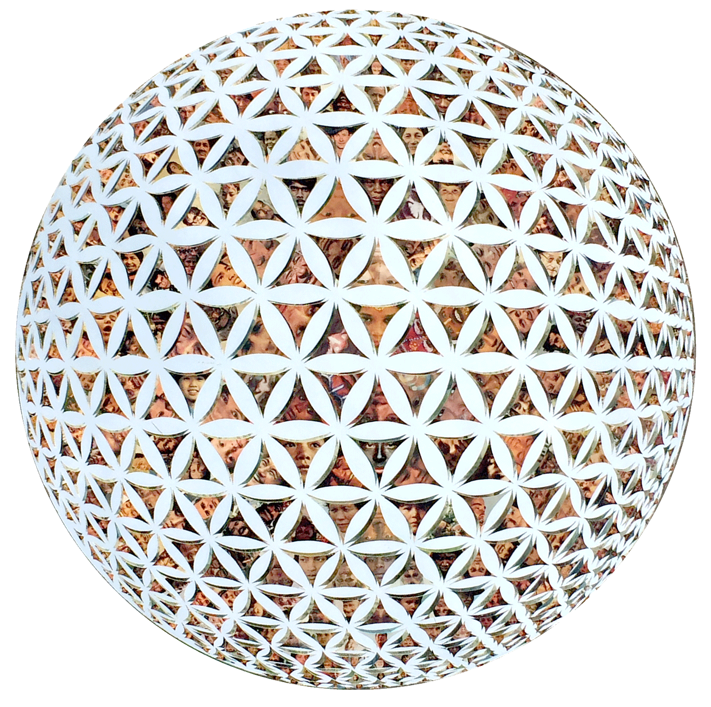 this artwork took approximately a year to complete. i was gifted the circular mirror by a studio mate, and then made a template to follow of a spherized ‘flower of life’ symbol. i then found faces in my collage materials to fit within the small shapes that comprise the flower of life. the title is taken from a buddhist exercise in which one sees every sentient being compassionately as one’s parent.
