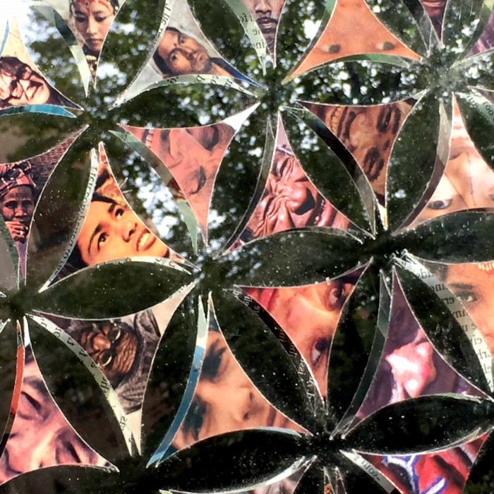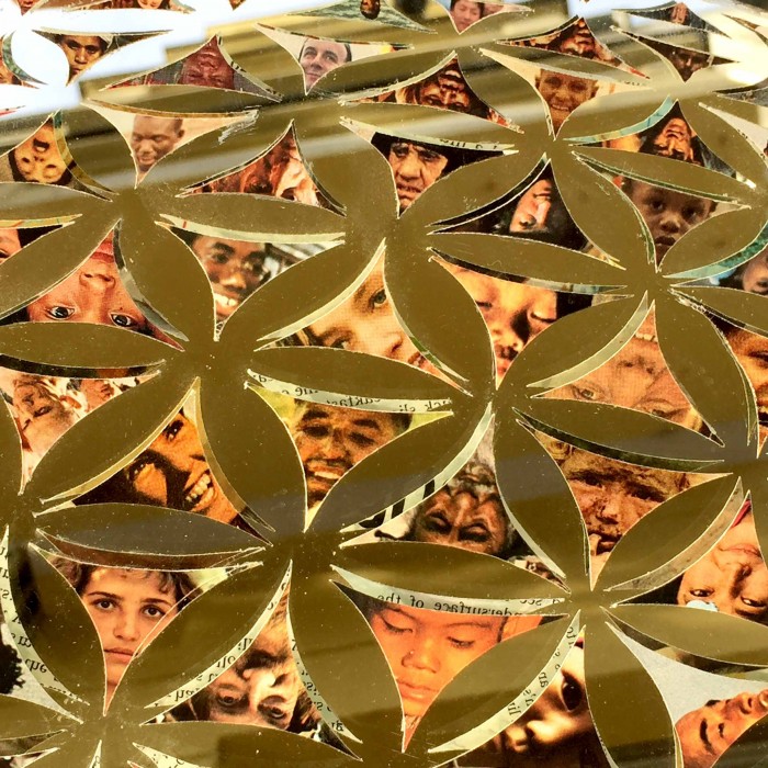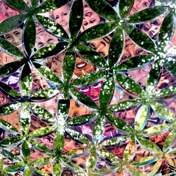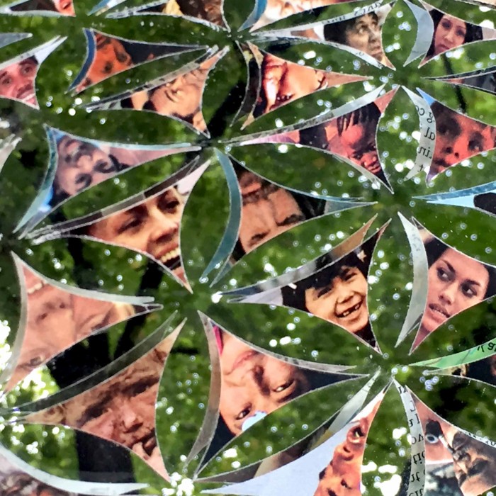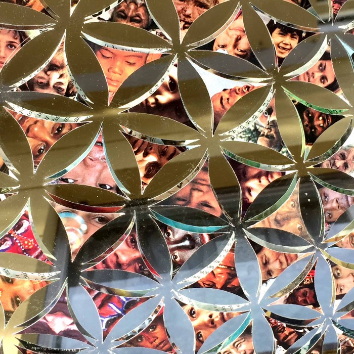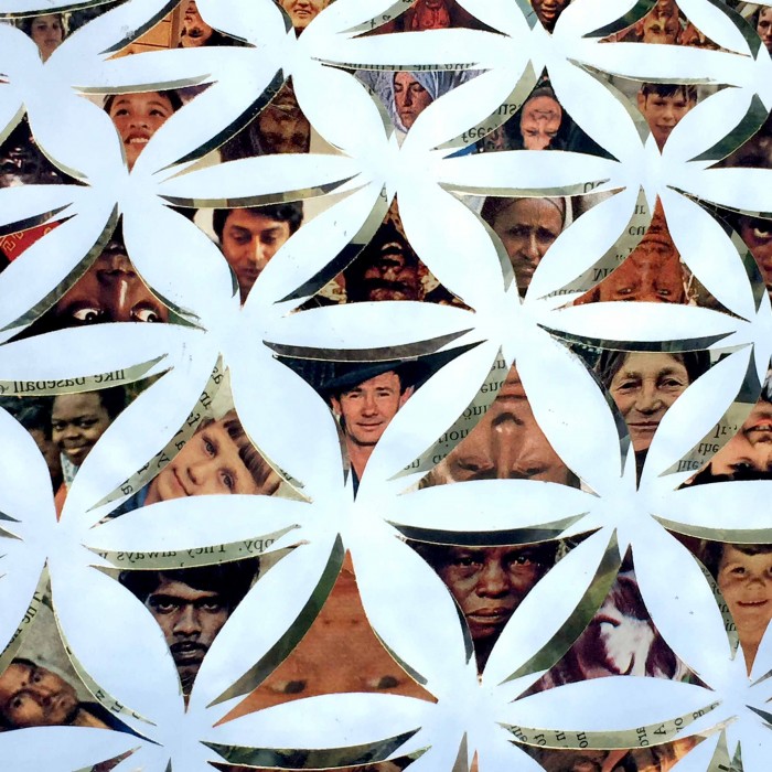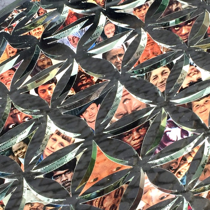 this artwork took approximately a year to complete. i was gifted the circular mirror by a studio mate, and then made a template to follow of a spherized ‘flower of life’ symbol. i then found faces in my collage materials to fit within the small shapes that comprise the flower of life. the title is taken from a buddhist exercise in which one sees every sentient being compassionately as one’s parent.