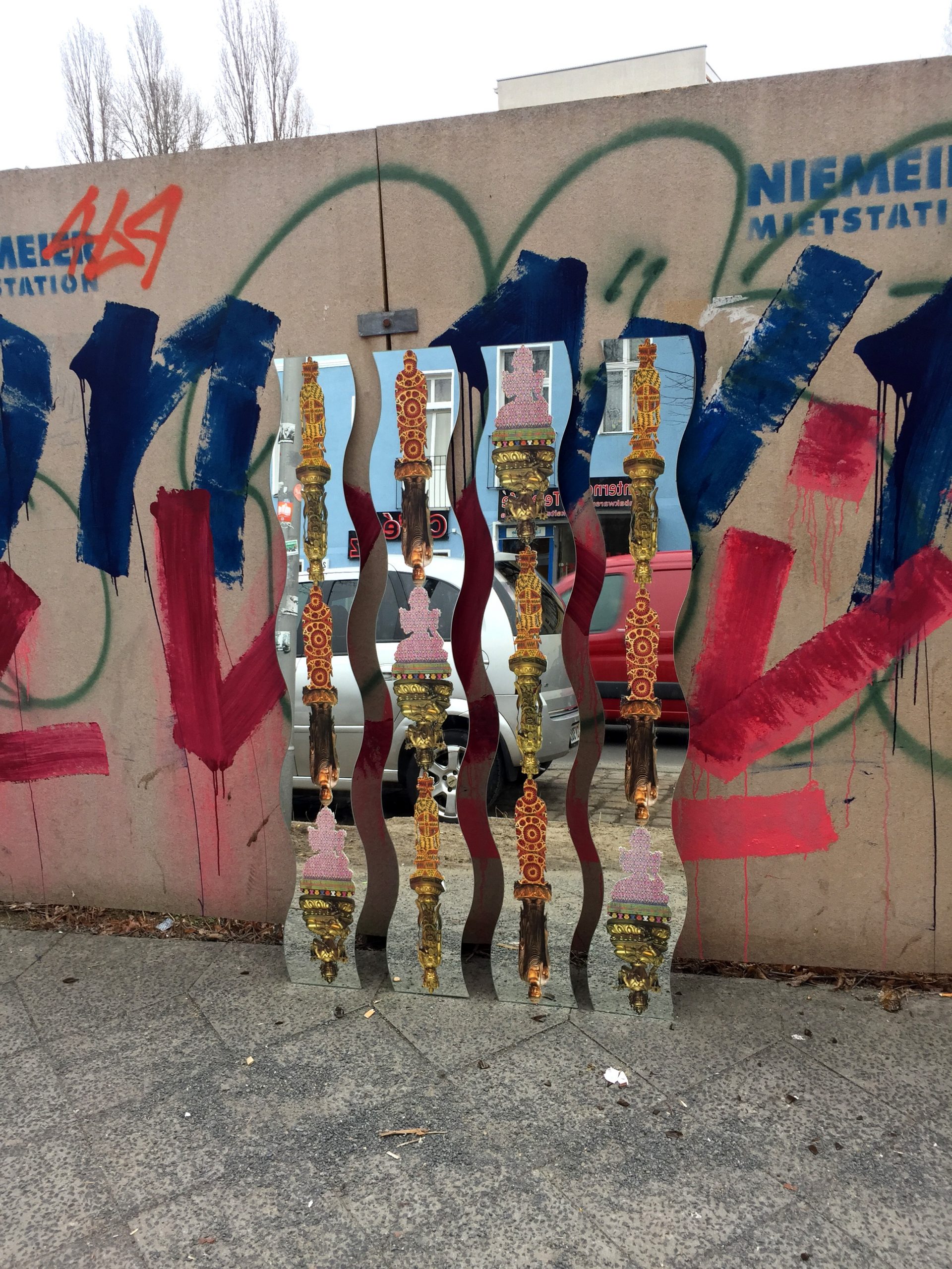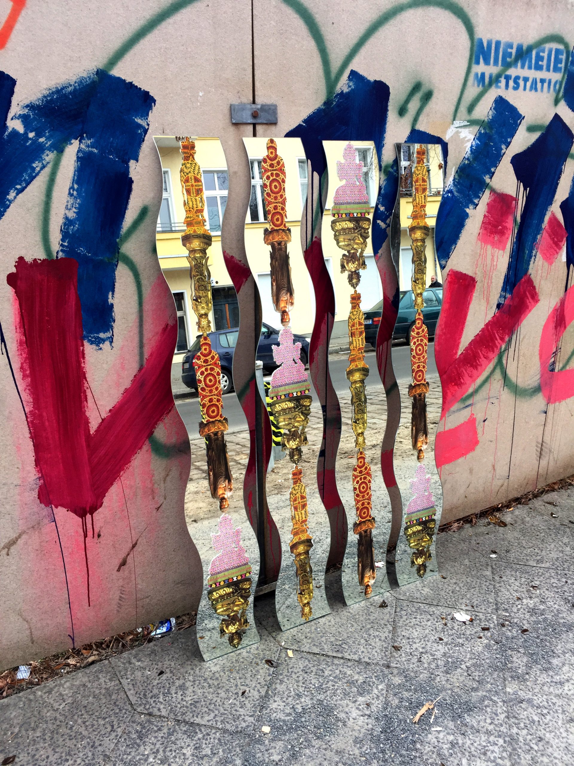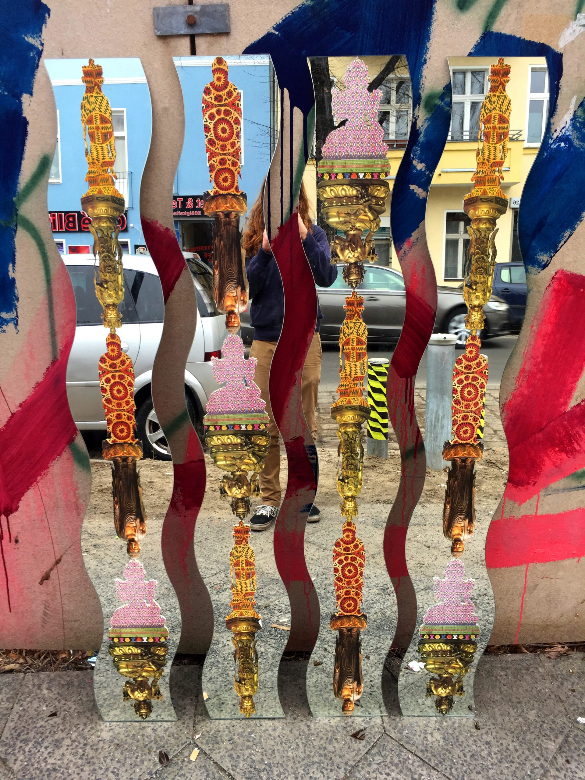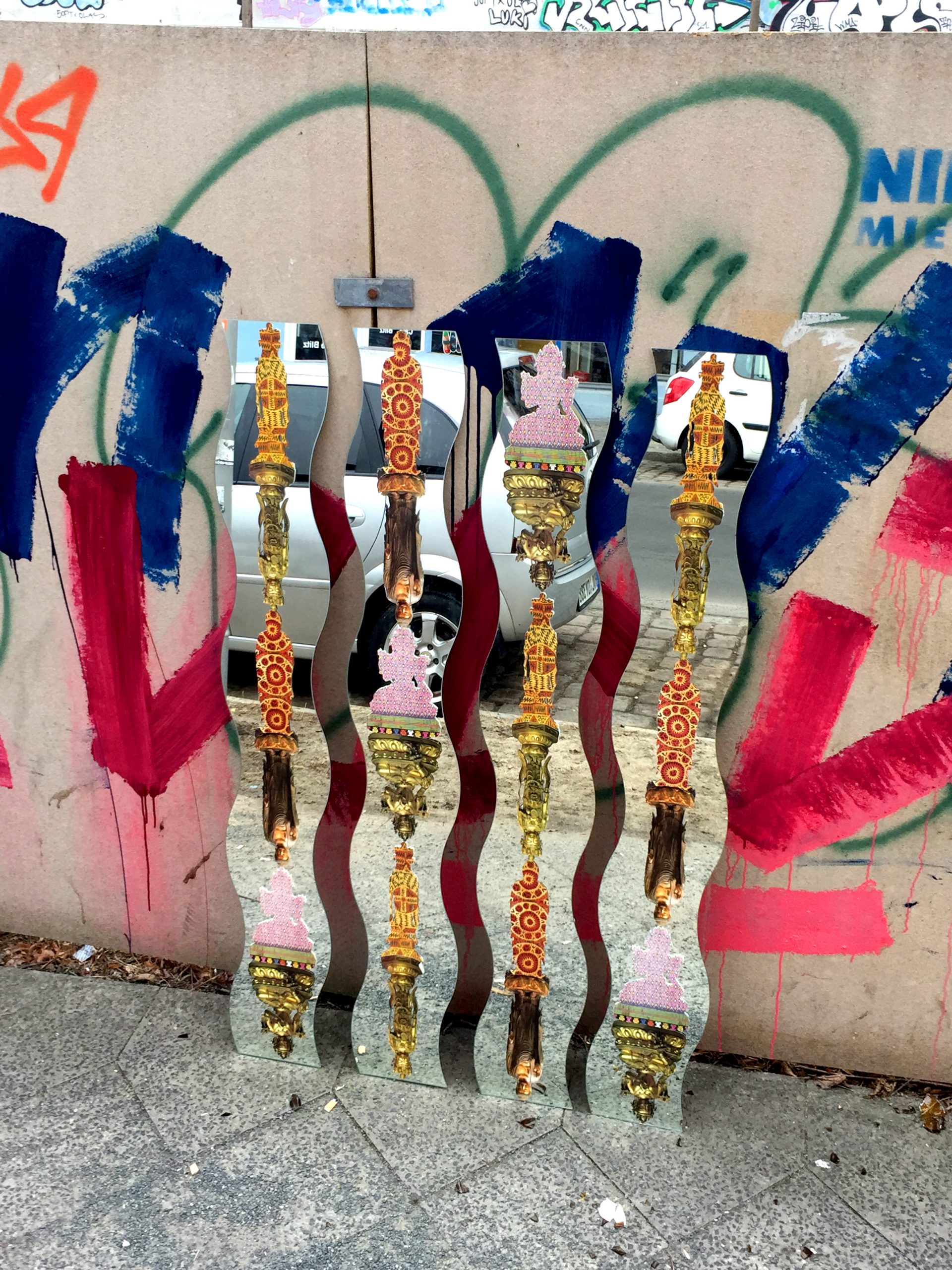 listen, paper collage on found ikea mirrors, 30cm x 200cm each, 2021