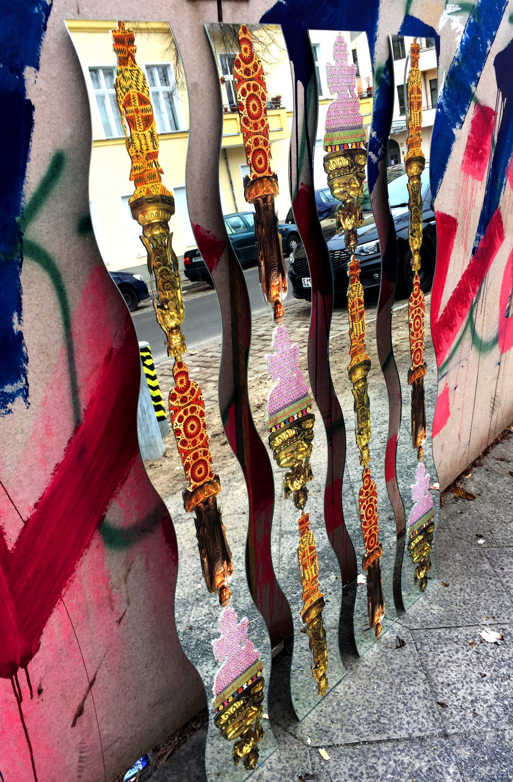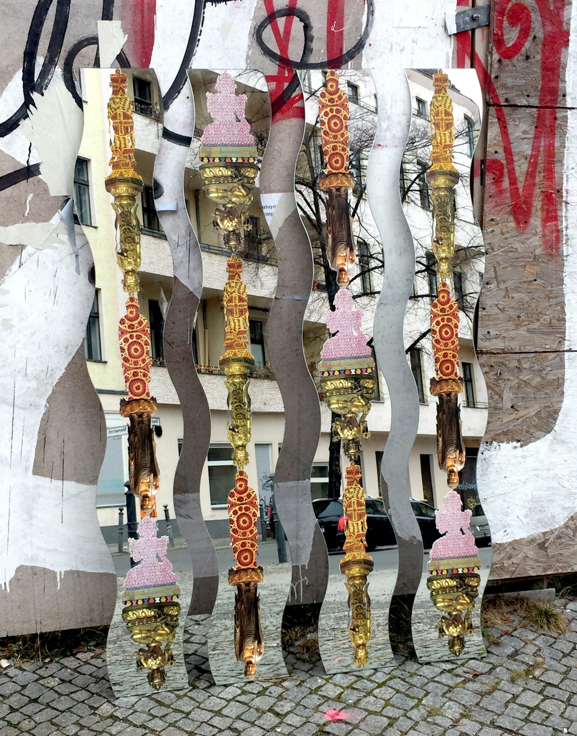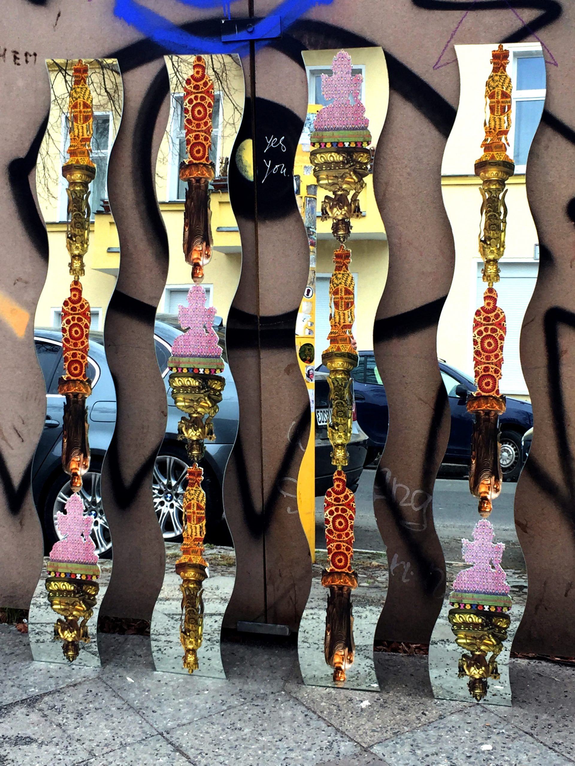 listen, paper collage on found ikea mirrors, 30cm x 200cm each, 2021