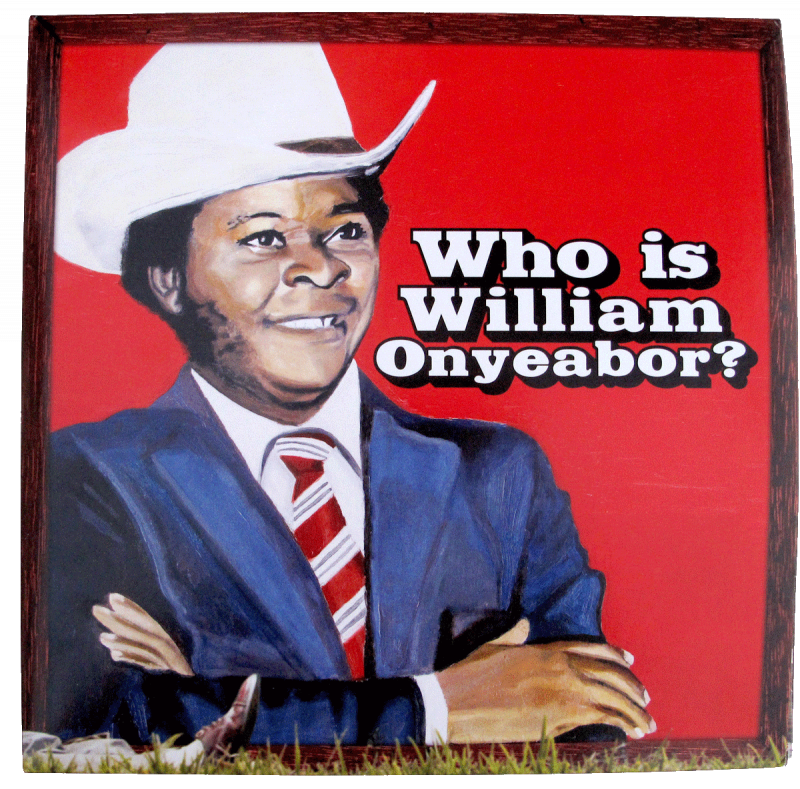 When Luaka Bop asked me to do the cover for Who is William Onyeabor? in 2013, I was overjoyed. I was immediately aware of how far the reach for this cover would be, and set to making my best work. After some initial variations, we arrived at the current cover through inspiration from a photo seen in a newspaper. I found the mdf panel that I painted Onyeabor on in an alley near my flat in San Francisco, and initially included the title but in a hand drawn font. Later, after this cover was chosen, I gave Luaka Bop the original painting, and tried to saw off some of the excess area around the image, but the mdf proved too tough to cut, and they arrived to have breakfast with me before I could finish. This left the original with a sawn gash halfway through and a red blotch at the bottom from the red I used to cover over the text that I originally painted on it. It’s currently hanging in their office.